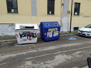 Alcuni cassonetti per la raccolta dei rifiuti posizionati sui parcheggi riservati alle persone disabili in via dei Sabini a Pescara....